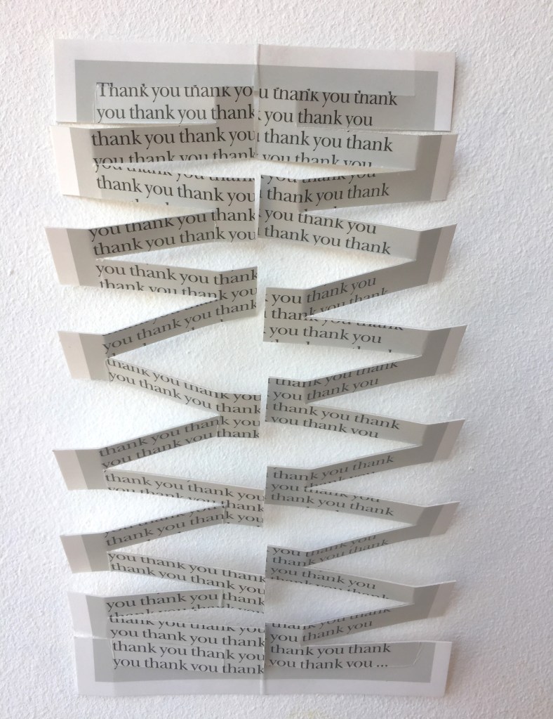 Flutterchromes (yellow and pink)Finissage (who’ll clean up come Monday morning)Waiting for Something Better Endless Column (cut postcard)Eternal Gratitude (cut postcard)1:1 (studio footprint)Ready (conflated paradigms)Double-Sided Piece
